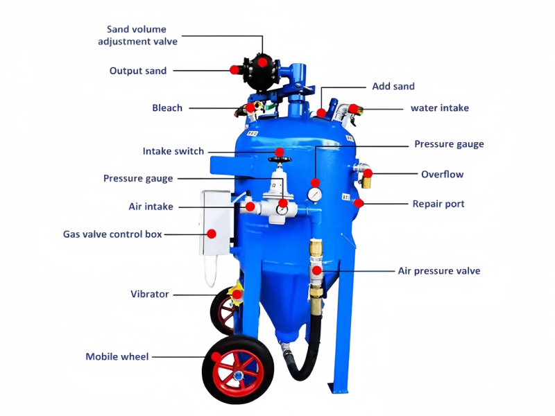 A dustless water sand blasting pot, also known as a wet blast pot, works on the principle of combining water with abrasive media and using compressed air to propel the mixture onto a surface at high speed to achieve cleaning, stripping or other surface preparation tasks. Here's a detailed explanation of its working principle: