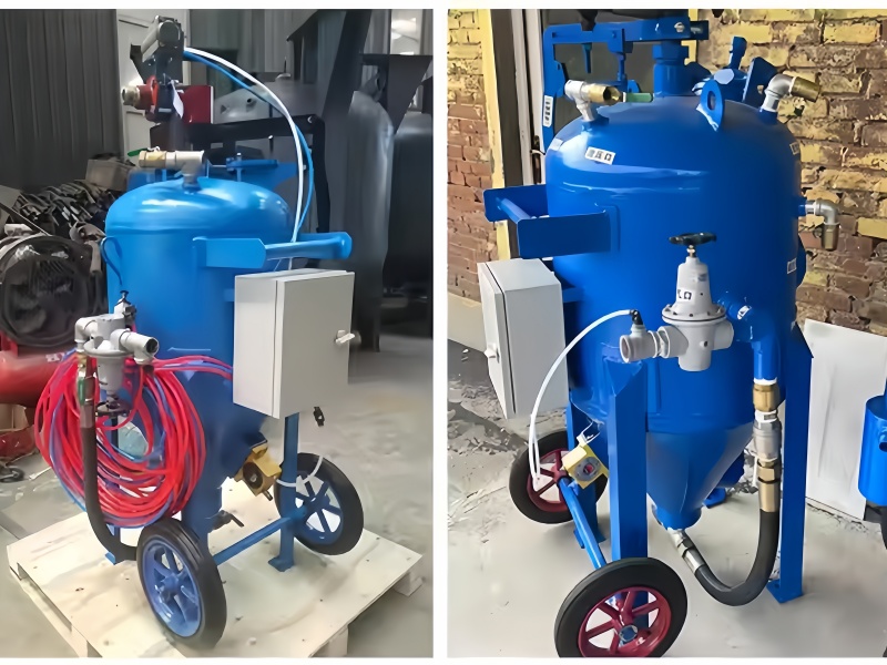A dustless water sand blasting pot, also known as a wet blast pot, works on the principle of combining water with abrasive media and using compressed air to propel the mixture onto a surface at high speed to achieve cleaning, stripping or other surface preparation tasks. Here's a detailed explanation of its working principle: